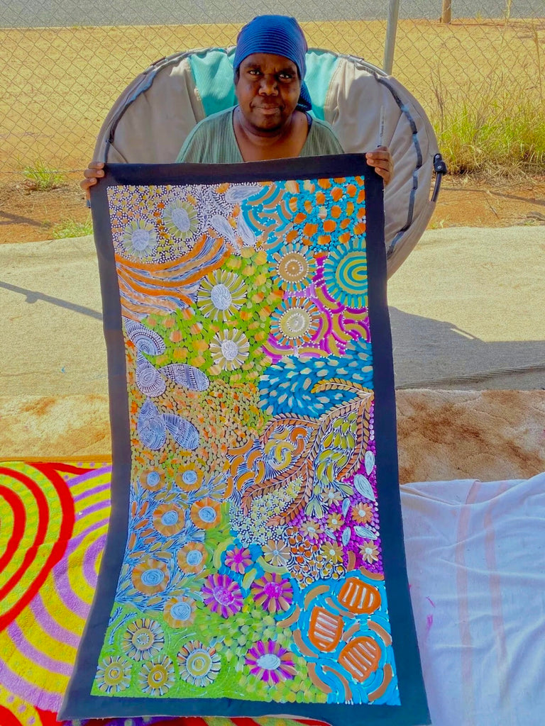 One of Karen's main dreamtime stories is the Alpar (Rat-tail plant). The plant itself is a small, heavily scented plant with a spike like flower. It is the clusters of this spiky flower, that resembles the rat-tail. There is also a black seed which is part of the plant, she often depicts this by painting black dot work to represent the seeds all dried up and ready to collect.