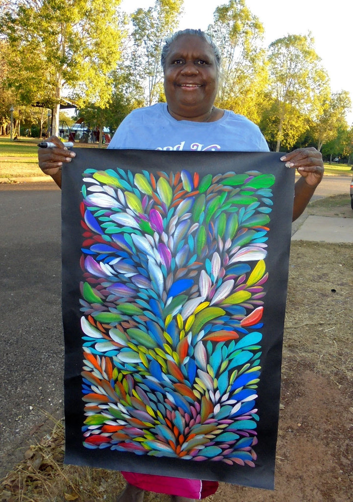 After she completed her school studies Louise moved back to Stirling station and worked with the Community Development Program. Her aunties, famous artists Gloria and Kathleen Petyerre, taught Louise to paint in 1981 and she sold her art through galleries in Alice Springs and across the Northern Territory up to Darwin, where she eventually moved in 1995.
