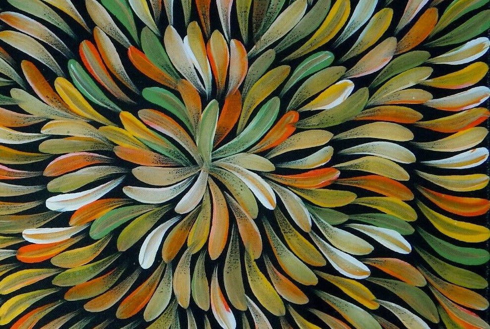 Mary Rumble Pitjara (Petyarre) was born in 1957 and lives in the Utopia region of central Australia. She is the sister of Katie Rumble and her extended family includes famous artists Gloria Petyarre and Gracie Morton Pwerle.