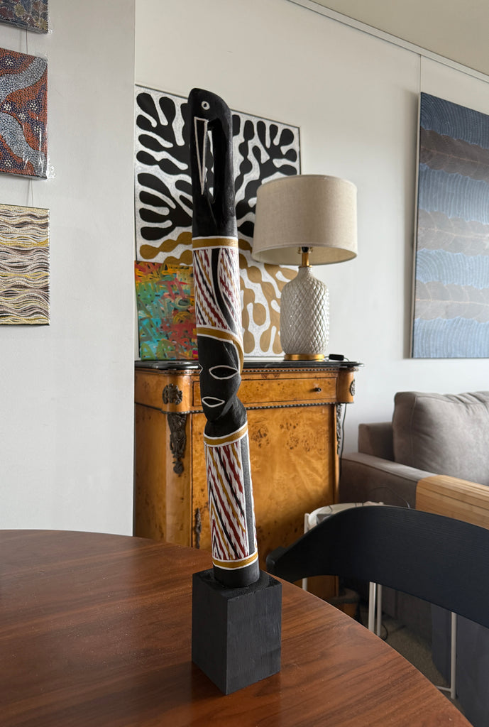 Christine Burarrwanga is a Yolngu woman, who comes from Yirrkala, N.E Arnhem Land, and is deeply connected to her culture and her country. She inherited her artistic style from her mother and she draws inspiration for her paintings and carvings from her ancestors’ knowledge, lore and stories.