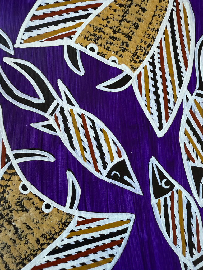 Christine Burarrwanga is a Yolngu woman, who comes from Yirrkala, N.E Arnhem Land, and is deeply connected to her culture and her country. She inherited her artistic style from her mother and she draws inspiration for her paintings and carvings from her ancestors’ knowledge, lore and stories.