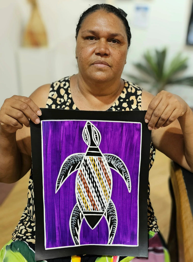 Christine Burarrwanga is a Yolngu woman, who comes from Yirrkala, N.E Arnhem Land, and is deeply connected to her culture and her country. She inherited her artistic style from her mother and she draws inspiration for her paintings and carvings from her ancestors’ knowledge, lore and stories.