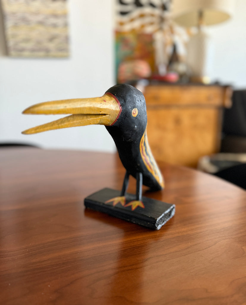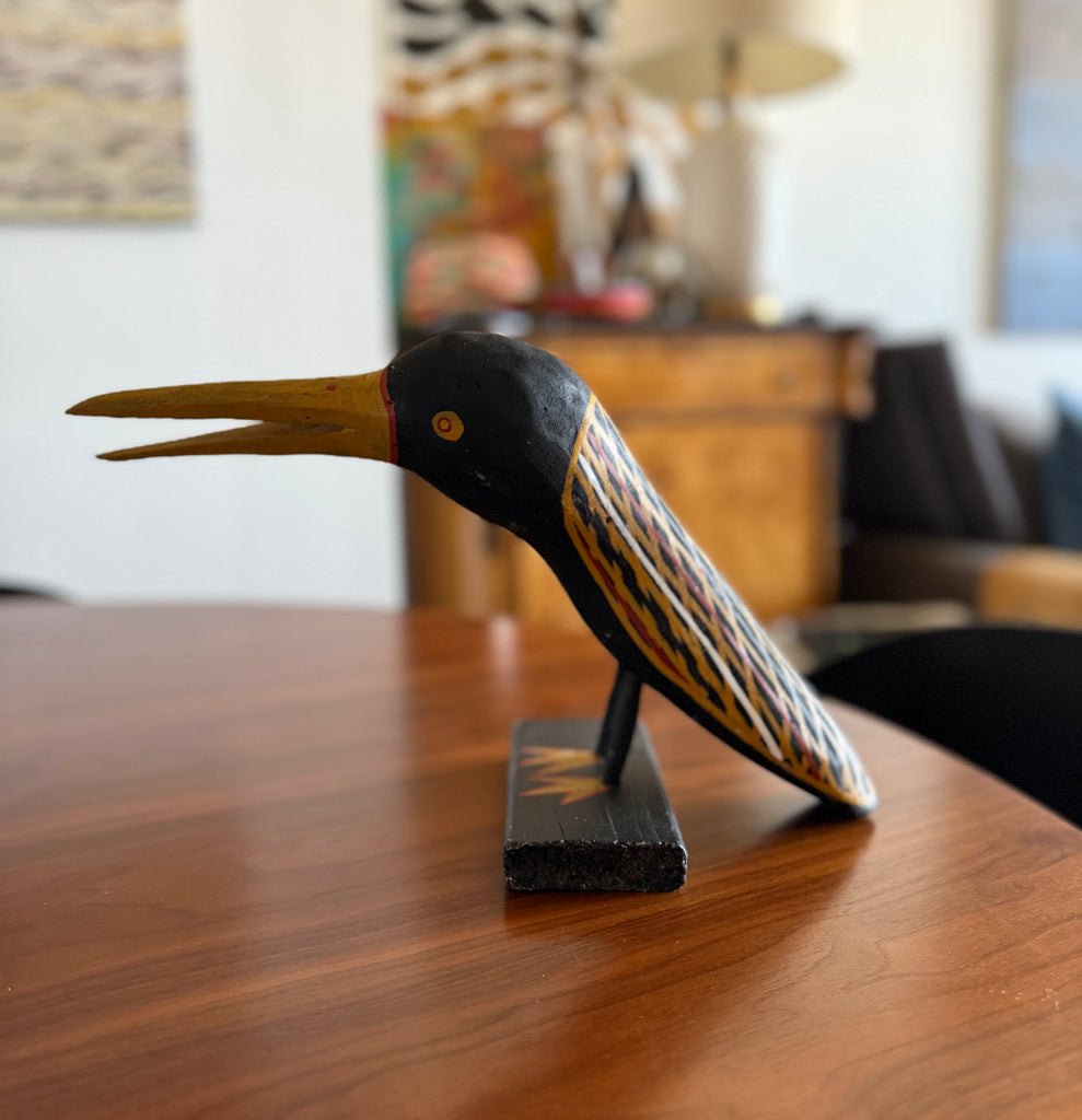 Crafted from locally gathered wood and painted by hand with vibrant acrylics, this striking sculpture showcases the blend of Elah’s carving skills and Barbara’s artistic flair. Together, they continue the Yolngu tradition of artistic collaboration between husband and wife.
