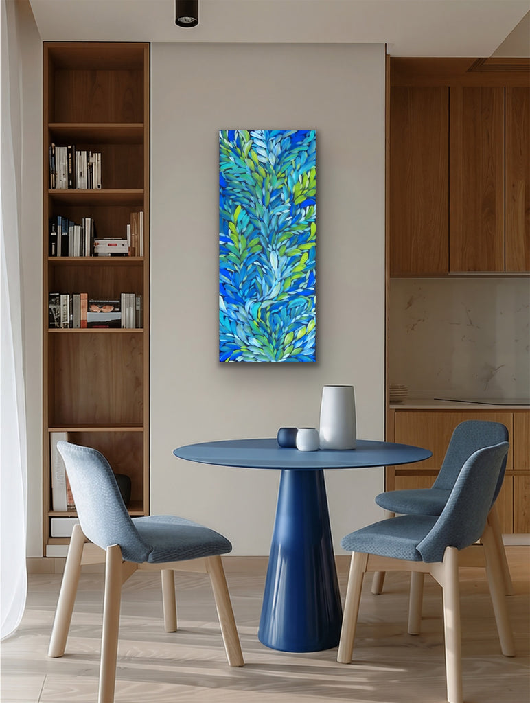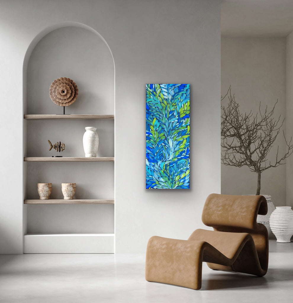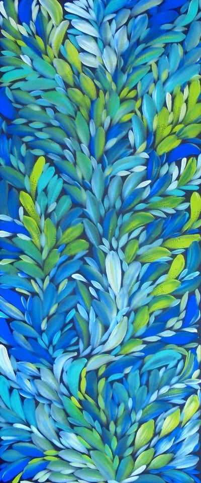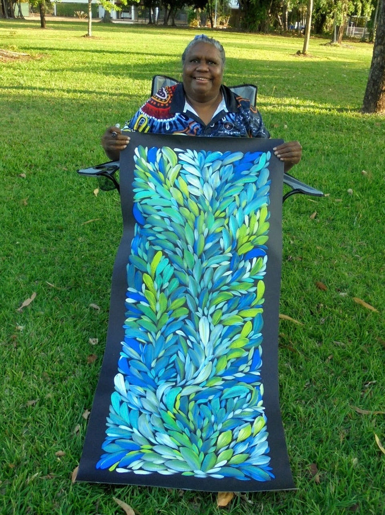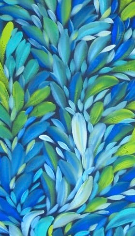 Louise’s paintings predominantly depict Kurrajong Bush Medicine Leaves. The women collect the Kurrajong Bush Medicine leaves from around the central desert area. The leaves are then boiled in a large tin bucket. The Kurrajong leaves are good for treating the flu, headache, backache, upset stomach and chest pains – where the leaves are repeatedly firmly pressed against the persons back or chest. For cuts and bruises the leaves are boiled longer until the oils float in them, it is mixed with an animal fat then applied to the wounds.