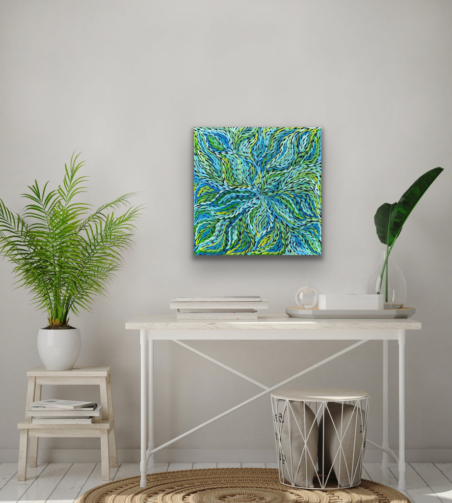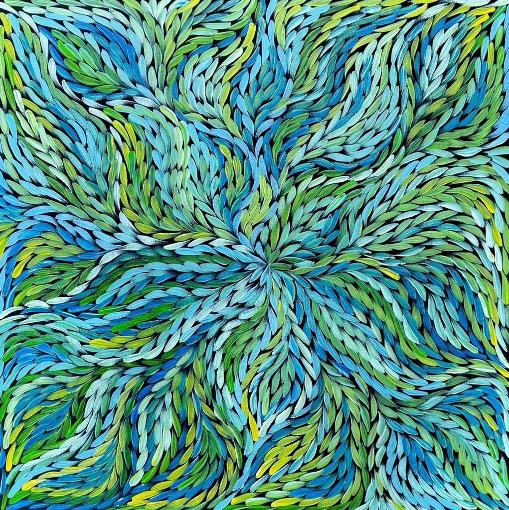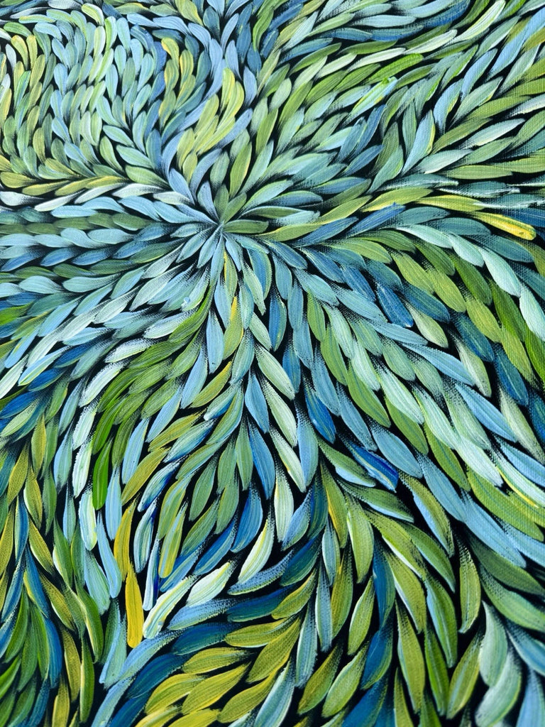 In her paintings, she incorporates traditional iconography and realistic elements. The themes are primarily bush medicines, yam dreaming and body painting. As a bush woman, she is familiar with her land and its abundance of bush tucker species, medicine plants and native fauna. These are the stories inherited by her, along with important women's stories, and which form the basis of her paintings.