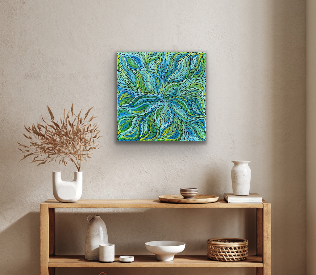 Rosemary’s works are usually characterized by the use of bright vibrant colours and a sense of flowing movement through the leaves.