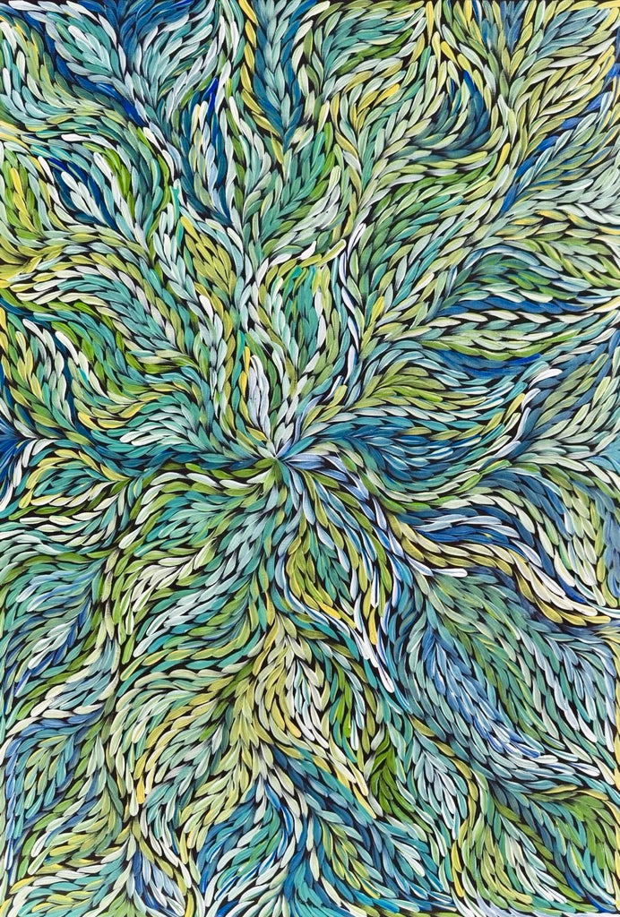 In her paintings, she incorporates traditional iconography and realistic elements. The themes are primarily bush medicines, yam dreaming and body painting. As a bush woman, she is familiar with her land and its abundance of bush tucker species, medicine plants and native fauna. These are the stories inherited by her, along with important women's stories, and which form the basis of her paintings.