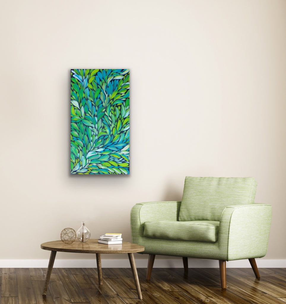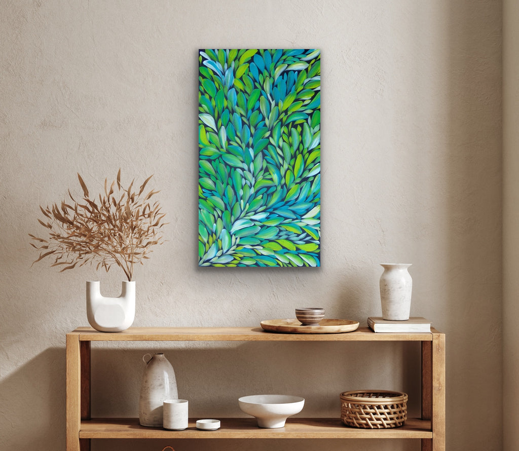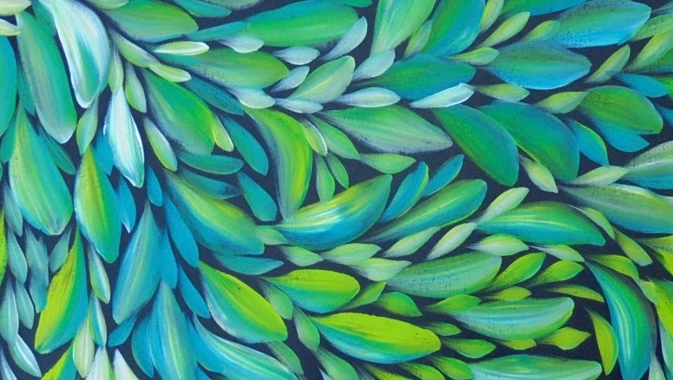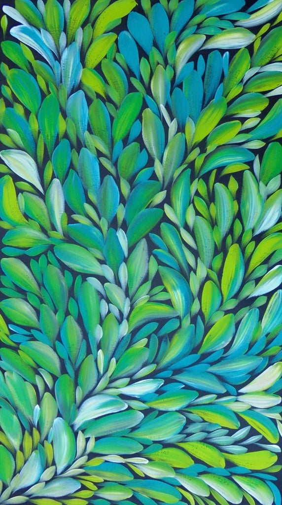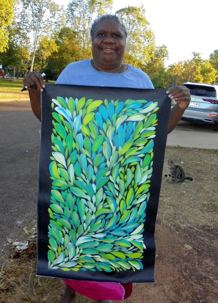 Louise’s paintings predominantly depict Kurrajong Bush Medicine Leaves. The women collect the Kurrajong Bush Medicine leaves from around the central desert area. The leaves are then boiled in a large tin bucket. The Kurrajong leaves are good for treating the flu, headache, backache, upset stomach and chest pains – where the leaves are repeatedly firmly pressed against the persons back or chest. For cuts and bruises the leaves are boiled longer until the oils float in them, it is mixed with an animal fat then applied to the wounds.